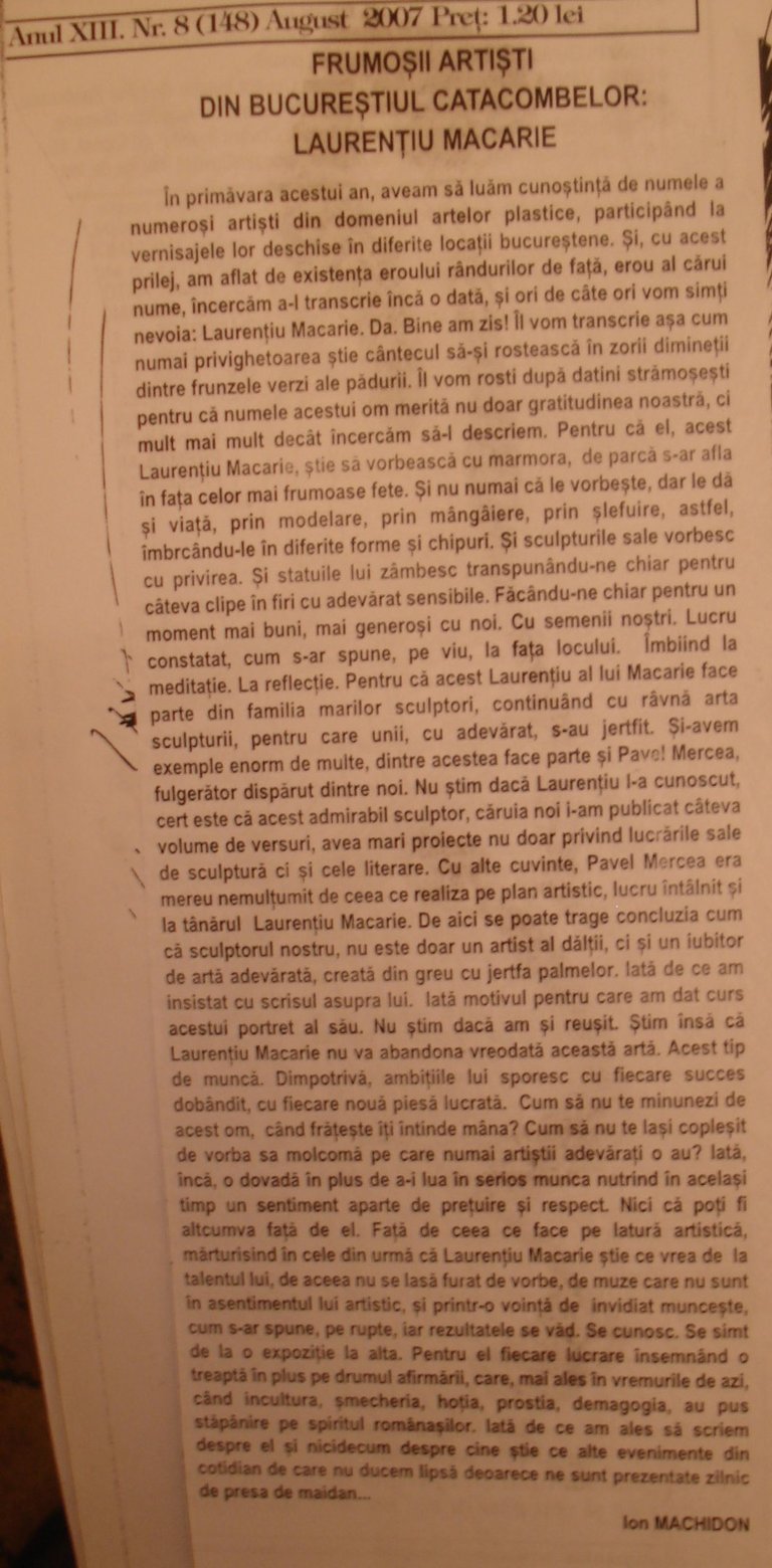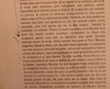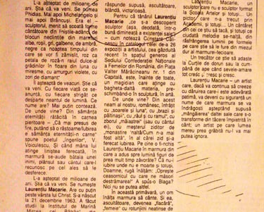 ”Pentru ca el, acest Laurentiu Macarie, stie sa vorbeasca cu marmura, de parca s-ar afla in fata celei mai frumoase fete. Si nu numai ca le vorbeste,dar le da si viata, prin modelare, prin mangaiere, prin slefuire, astfel imbracandule in diferite forme si chipuri.”