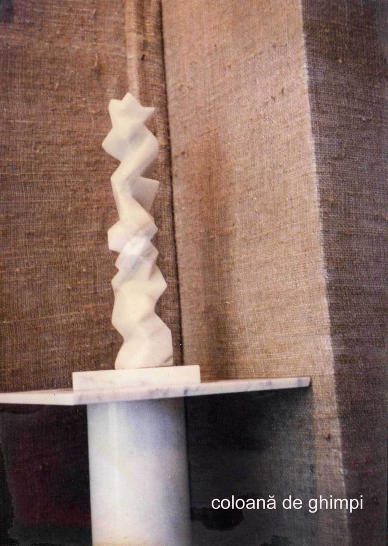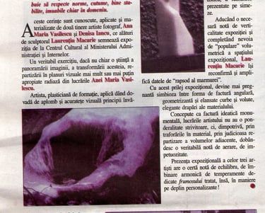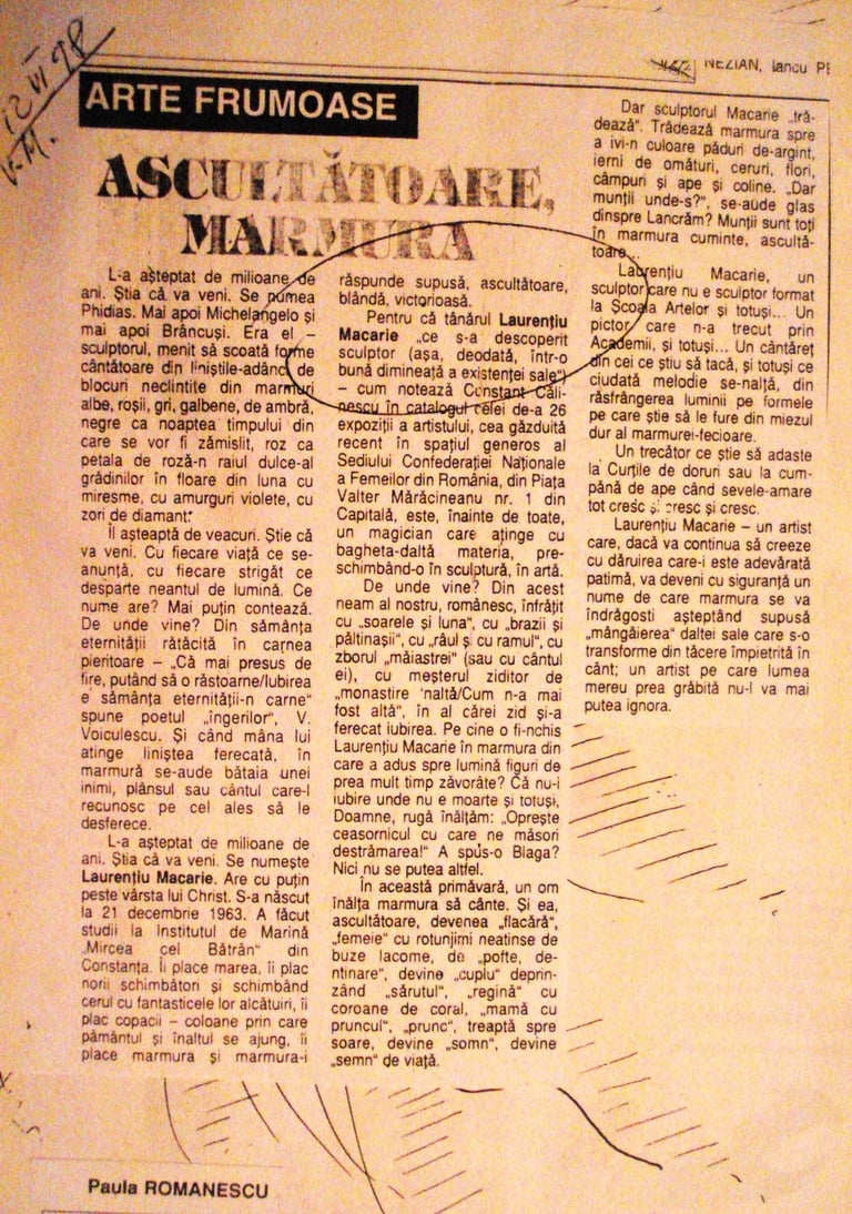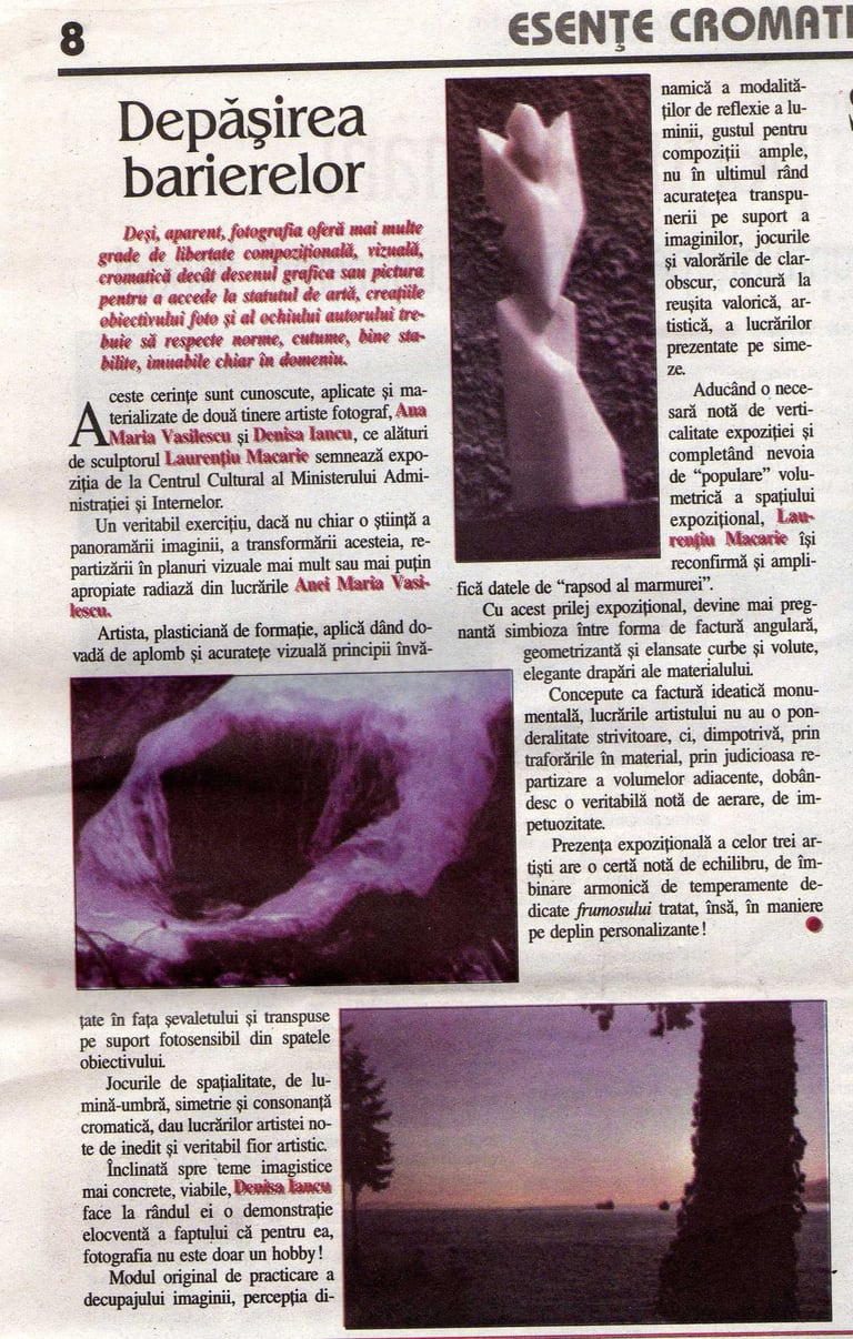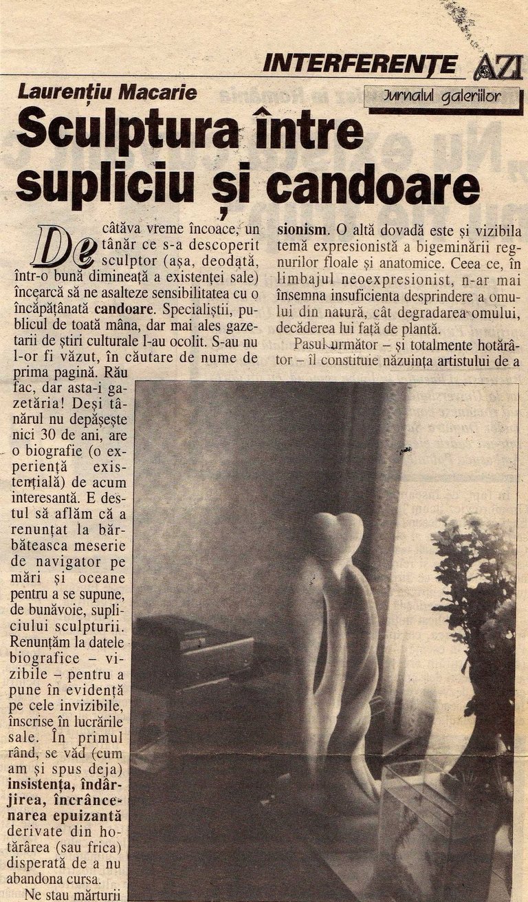 ”Aducand o necesara nota de verticalitate expozitiei si compltand nevoia de ”populare” volumetrica a spatiului expozitional, Laurentiu Macarie isi reconfirma si amplifica datele de ”rapsod al marmurei”.